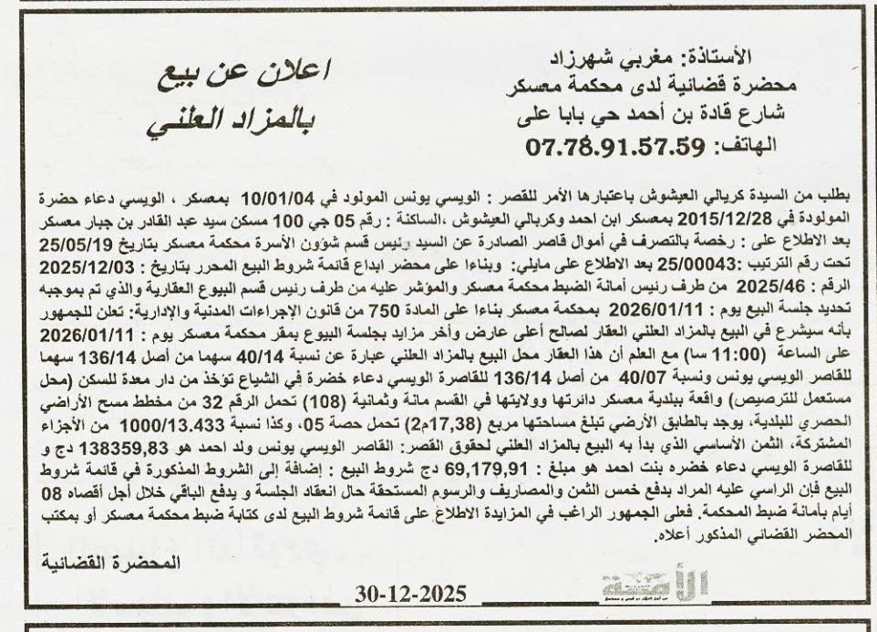 Il sera procédé à la vente au plus offrant et dernier enchérisseur le : 11/01/2026';