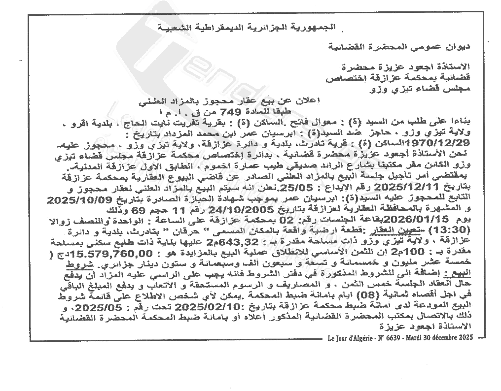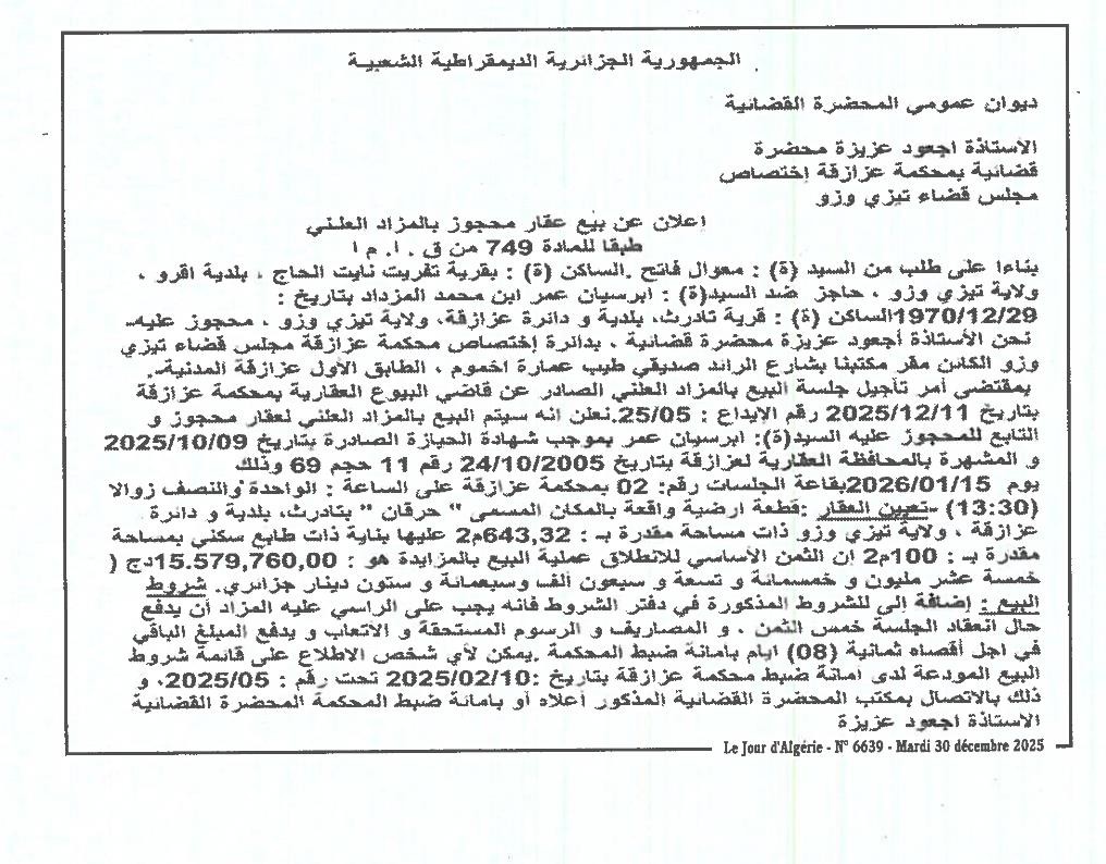 Il sera procédé à la vente au plus offrant et dernier enchérisseur le :