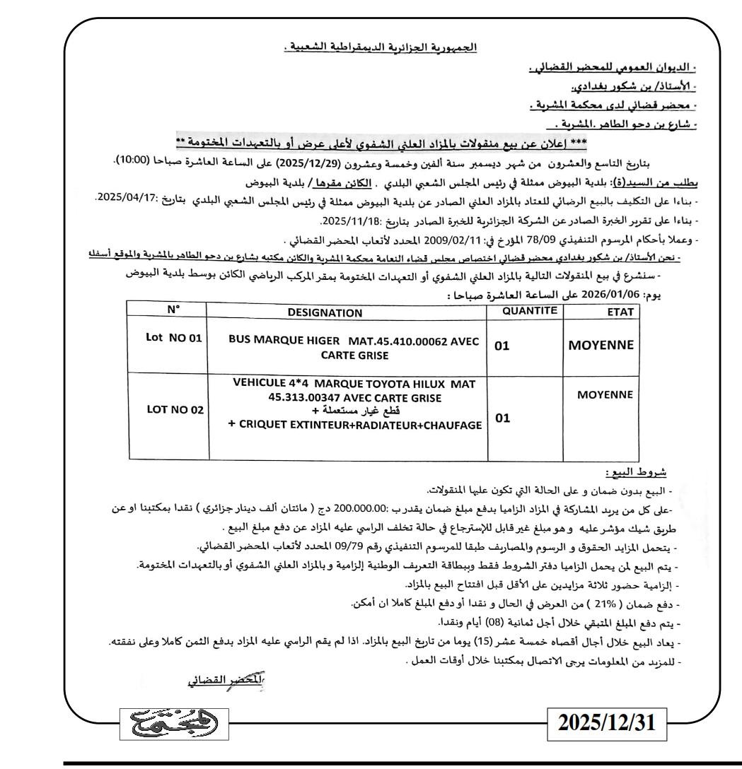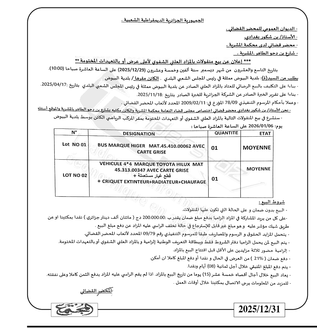| Objet: Vente de divers équipements et véhicules | |