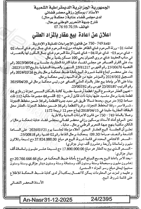Il sera procédé à la vente au plus offrant et dernier enchérisseur le :