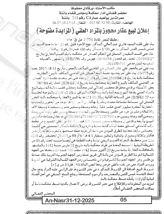 Il sera procédé à la vente au plus offrant et dernier enchérisseur le : 07/01/2026';