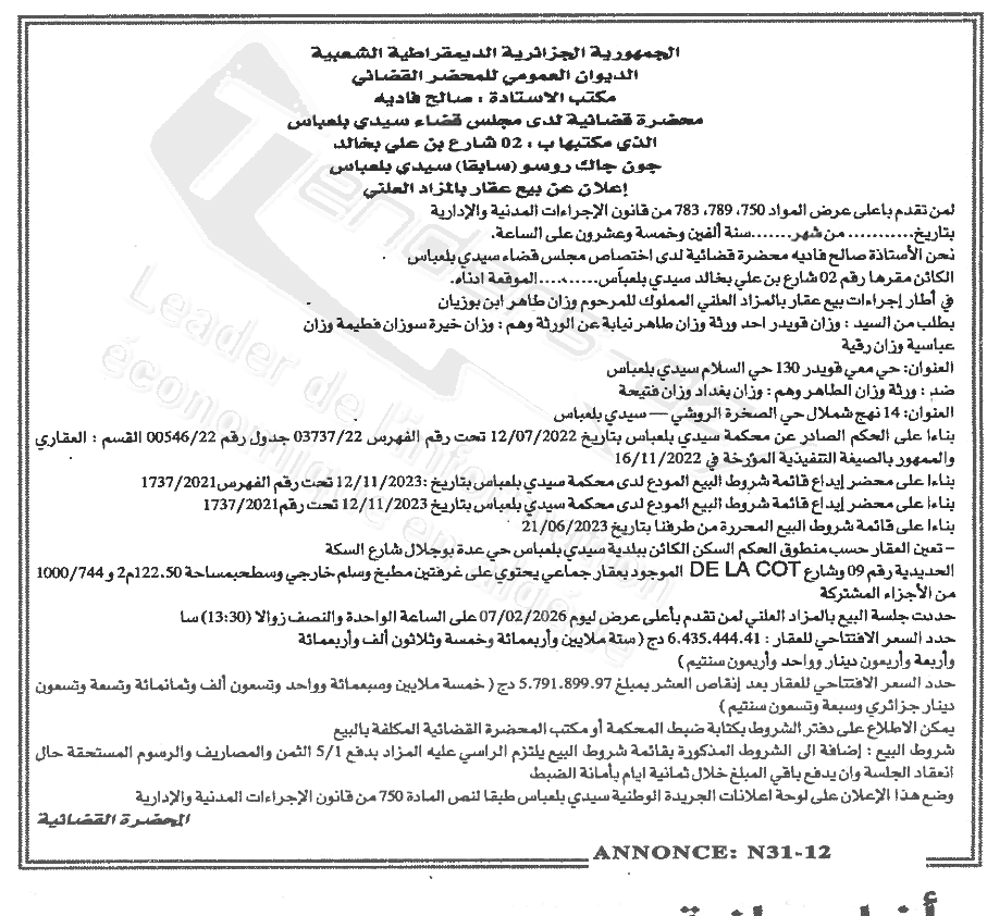 Il sera procédé à la vente au plus offrant et dernier enchérisseur le :