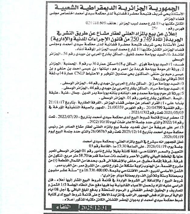 Il sera procédé à la vente au plus offrant et dernier enchérisseur le : 07/01/2026';