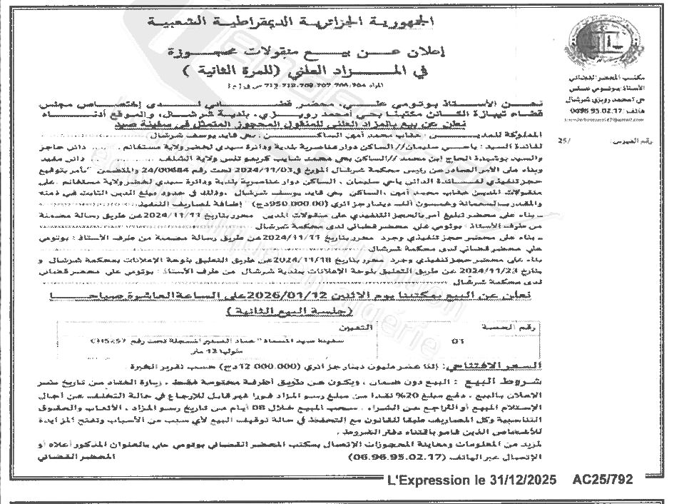 Il sera procédé à la vente au plus offrant et dernier enchérisseur le :