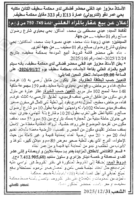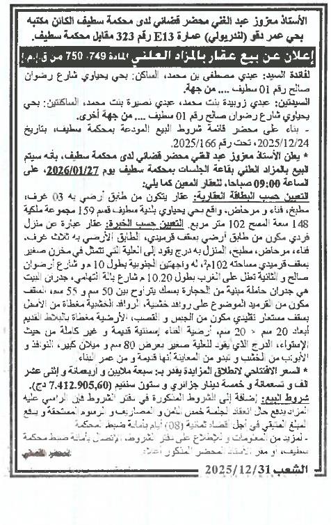Il sera procédé à la vente au plus offrant et dernier enchérisseur le : 27/01/2026';