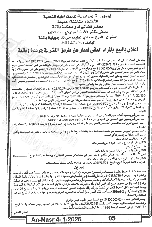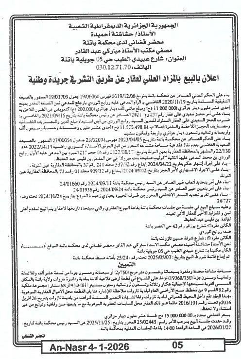 Il sera procédé à la vente au plus offrant et dernier enchérisseur le : 27/01/2026';