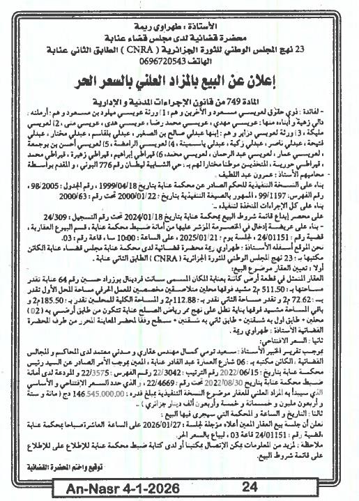 Il sera procédé à la vente au plus offrant et dernier enchérisseur le :