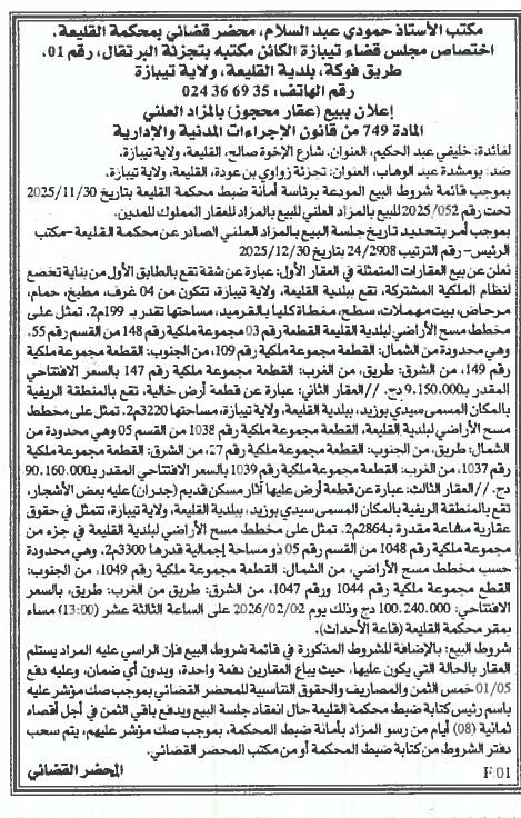 Il sera procédé à la vente au plus offrant et dernier enchérisseur le : 11/01/2026';