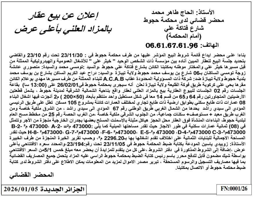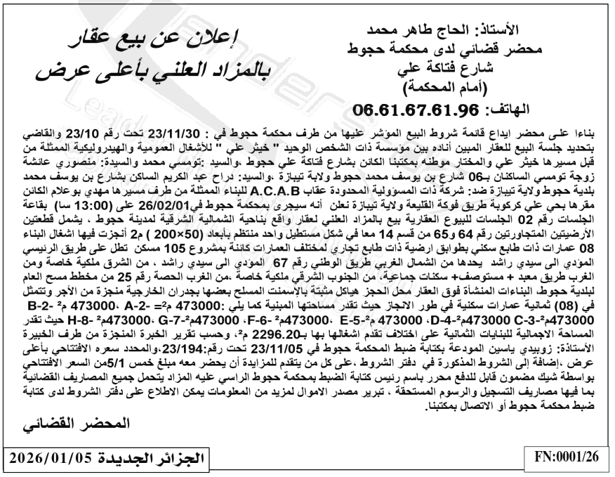 Il sera procédé à la vente au plus offrant et dernier enchérisseur le :