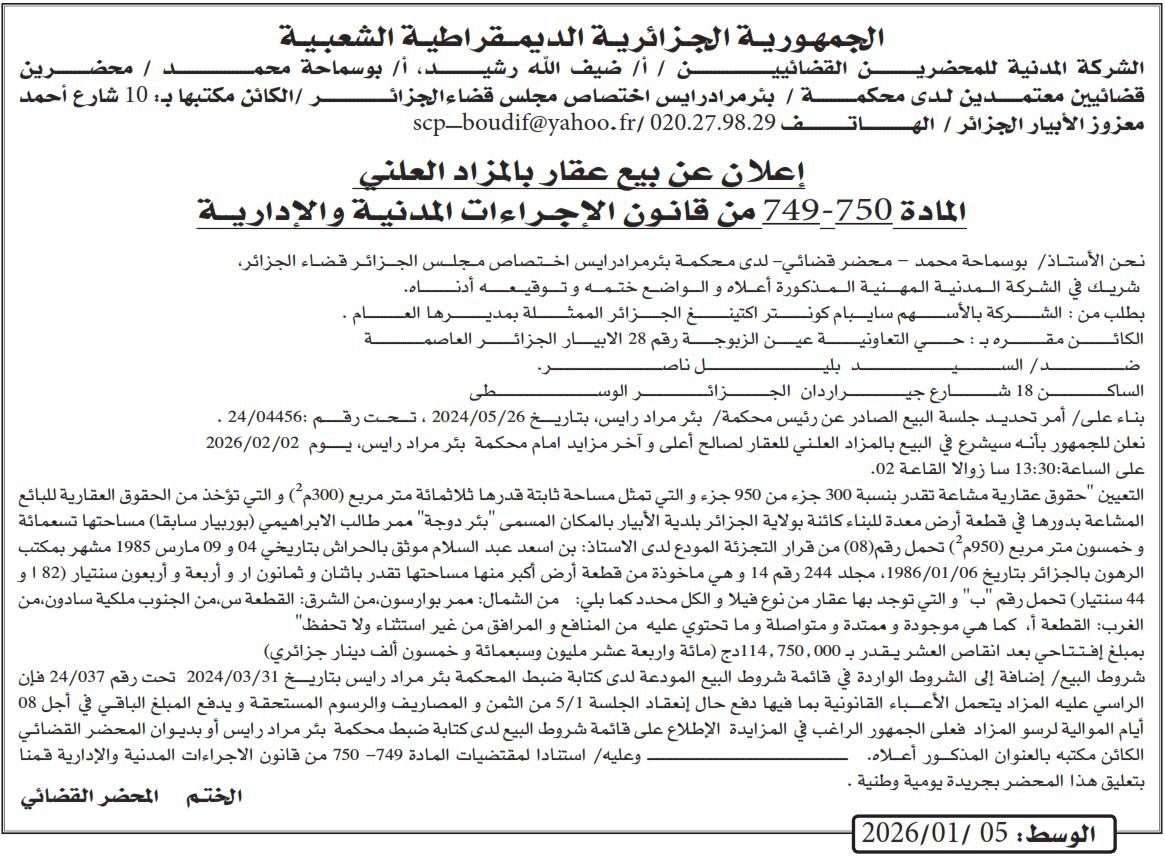 Il sera procédé à la vente au plus offrant et dernier enchérisseur le : 12/01/2026';