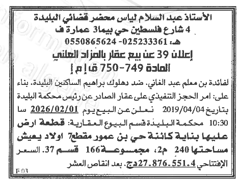Il sera procédé à la vente au plus offrant et dernier enchérisseur le :