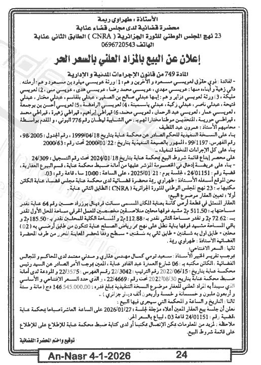 Il sera procédé à la vente au plus offrant et dernier enchérisseur le : 27/01/2026';