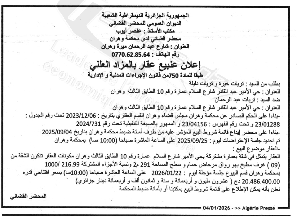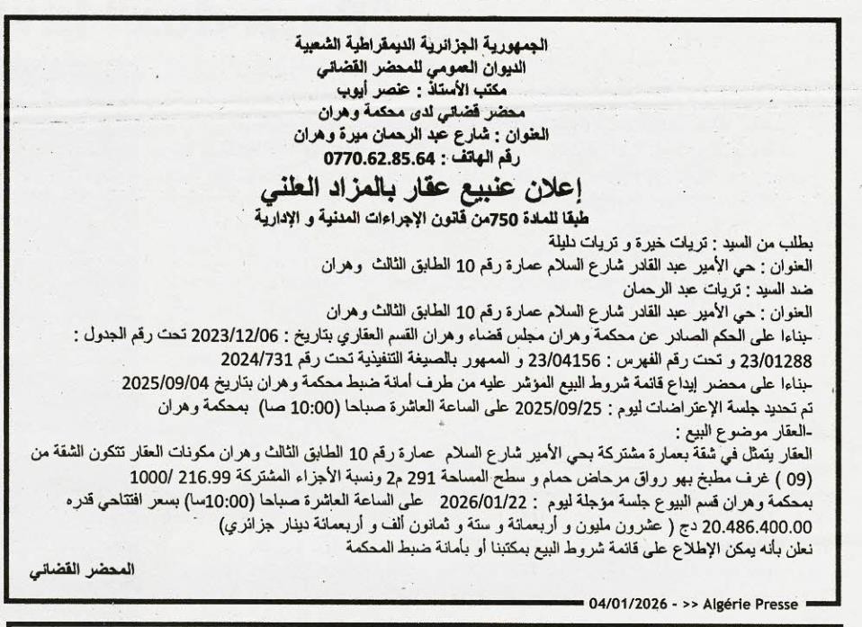 Il sera procédé à la vente au plus offrant et dernier enchérisseur le :