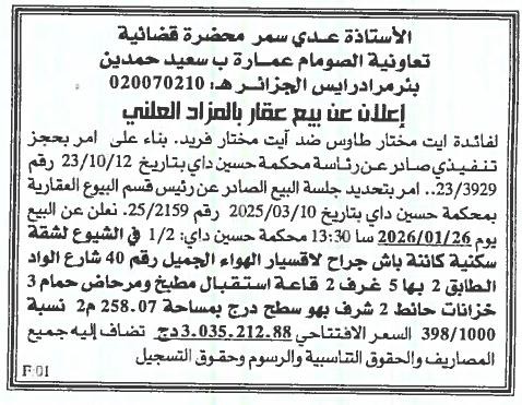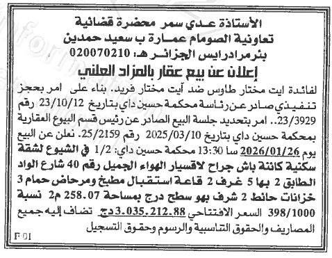 Il sera procédé à la vente au plus offrant et dernier enchérisseur le : 13/01/2026';