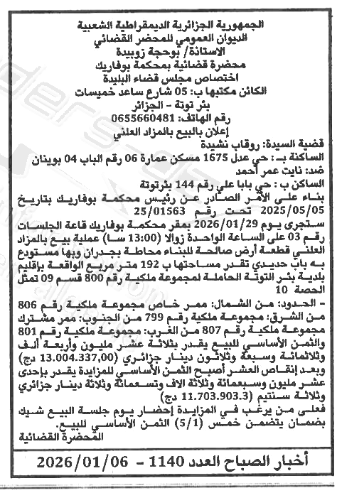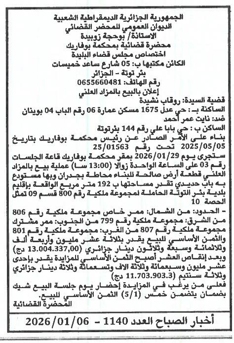 Il sera procédé à la vente au plus offrant et dernier enchérisseur le : 13/01/2026';