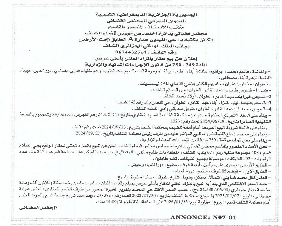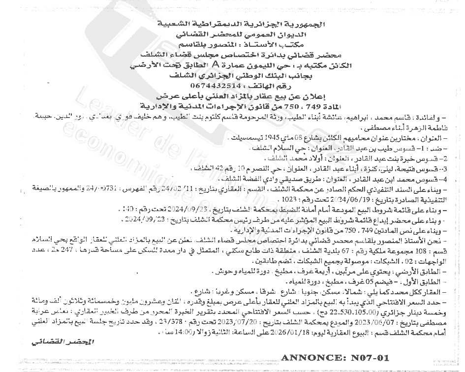 Il sera procédé à la vente au plus offrant et dernier enchérisseur le :