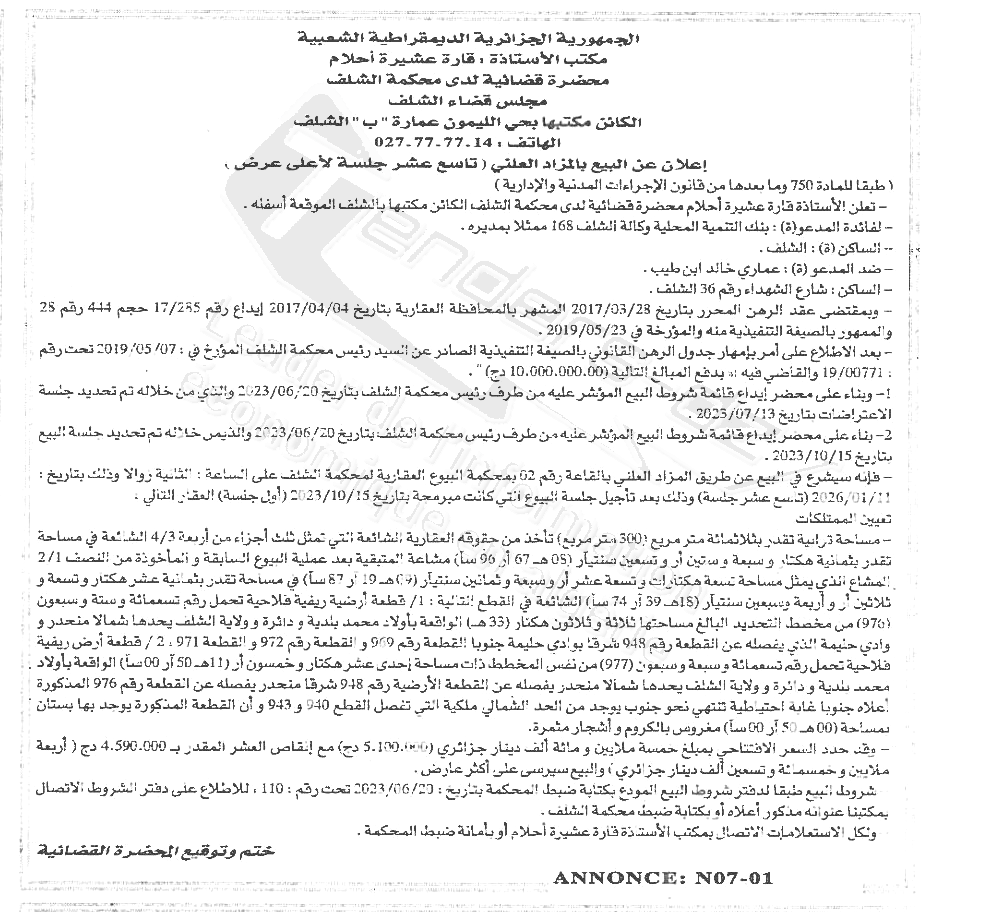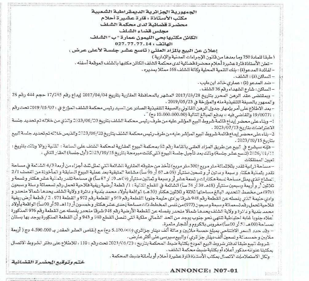 Il sera procédé à la vente au plus offrant et dernier enchérisseur le :