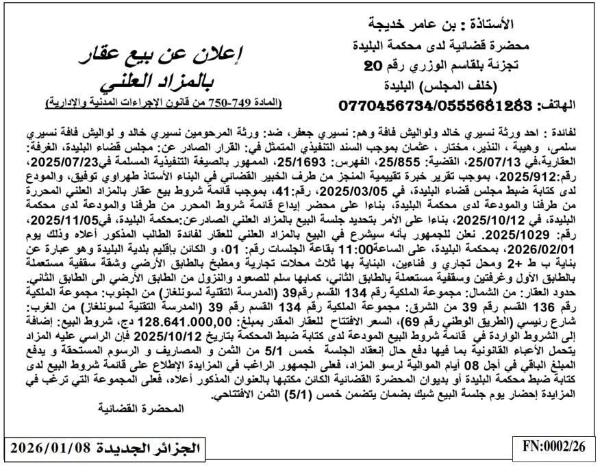 Il sera procédé à la vente au plus offrant et dernier enchérisseur le : 01/02/2026';