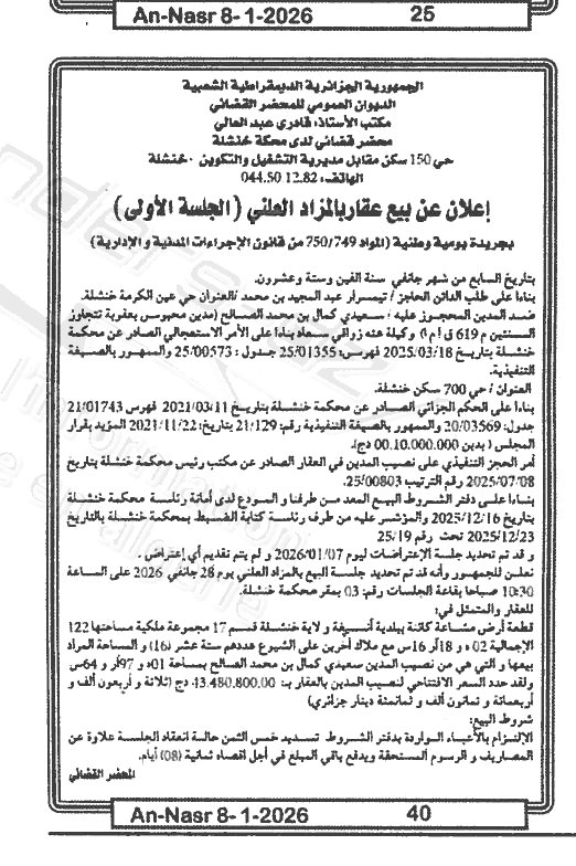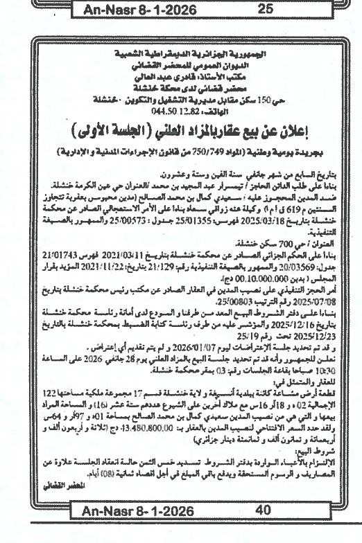 Il sera procédé à la vente au plus offrant et dernier enchérisseur le :