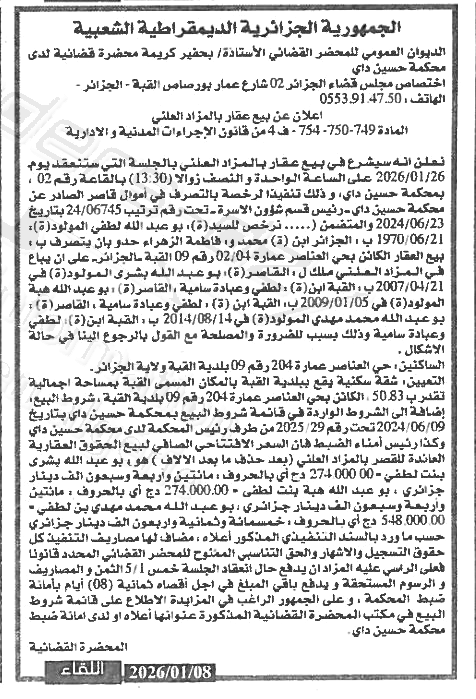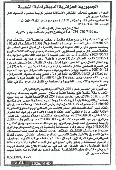 Il sera procédé à la vente au plus offrant et dernier enchérisseur le : 26/01/2026';
