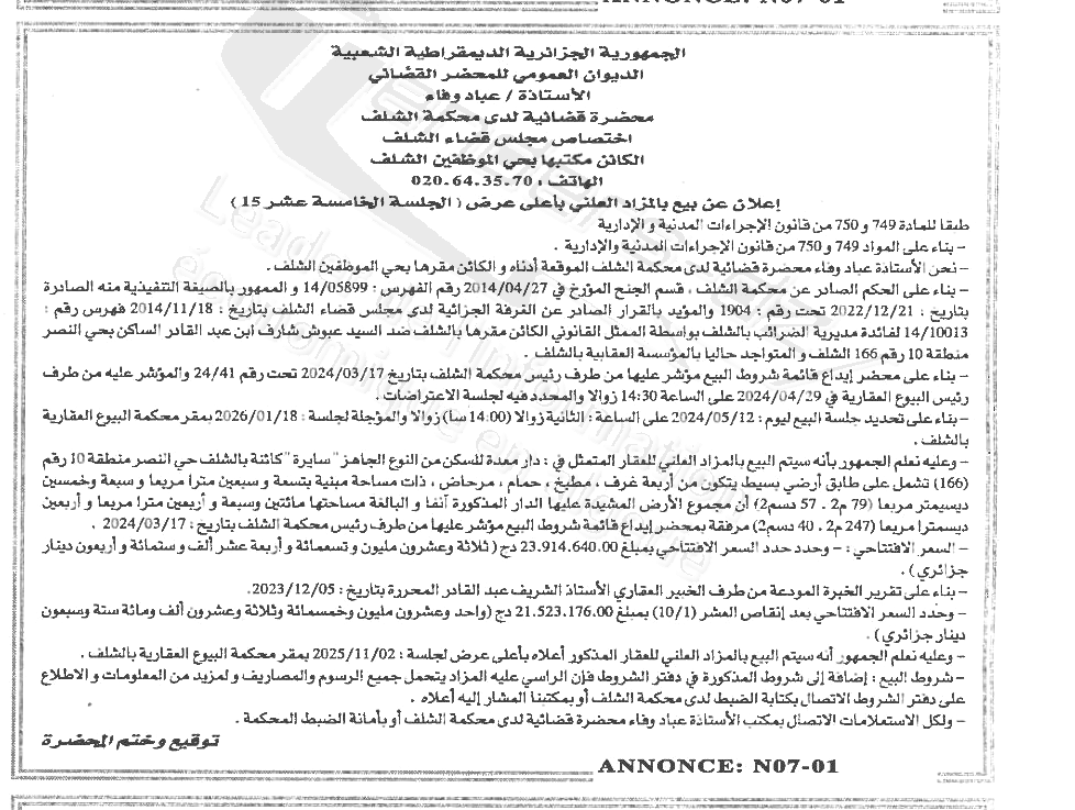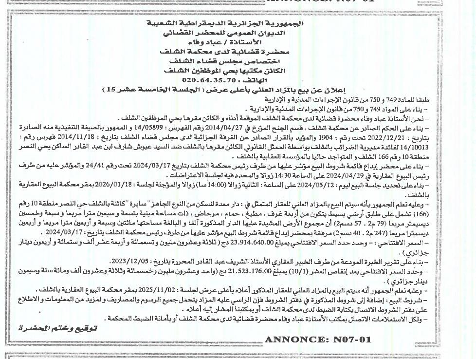 Il sera procédé à la vente au plus offrant et dernier enchérisseur le :