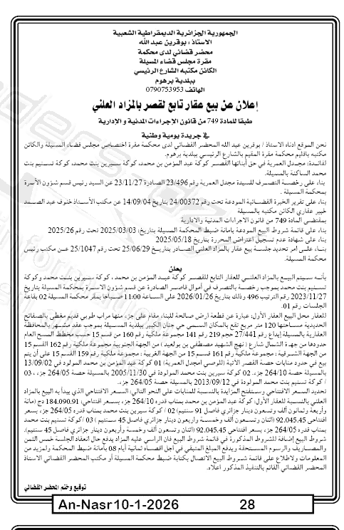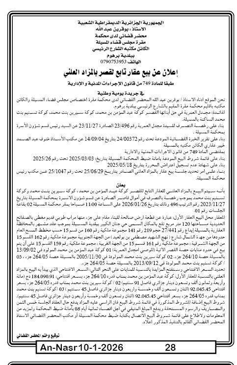 Il sera procédé à la vente au plus offrant et dernier enchérisseur le :