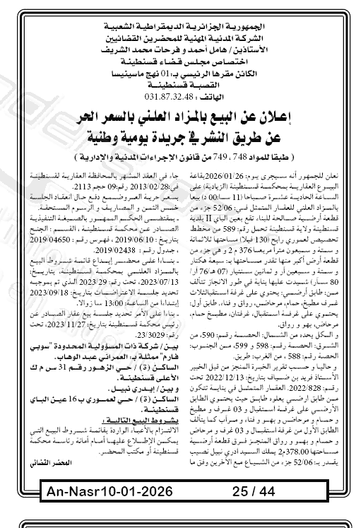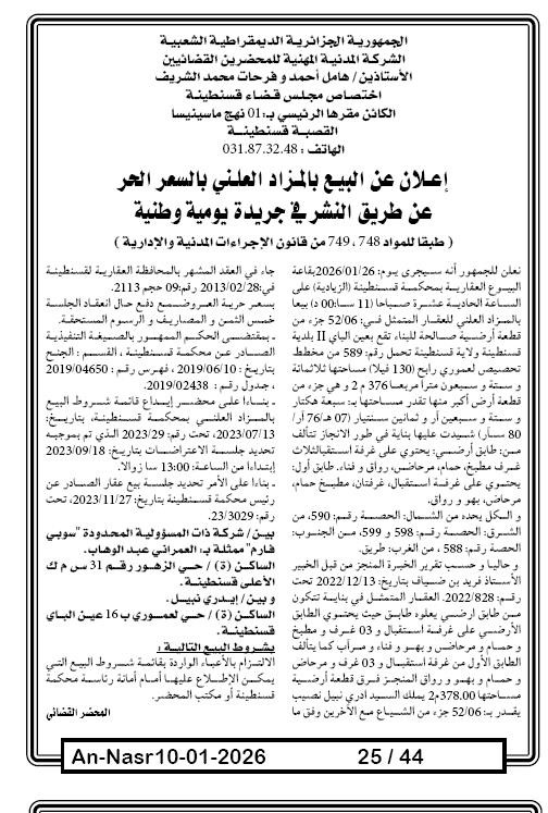 Il sera procédé à la vente au plus offrant et dernier enchérisseur le : 17/01/2026';
