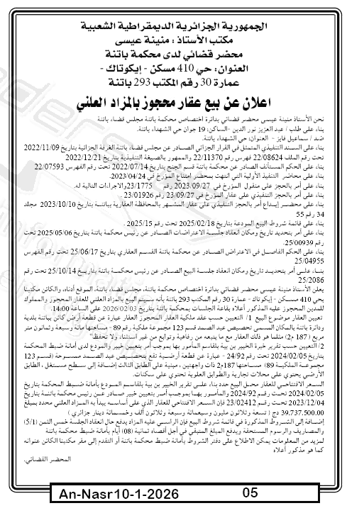Il sera procédé à la vente au plus offrant et dernier enchérisseur le : 17/01/2026';