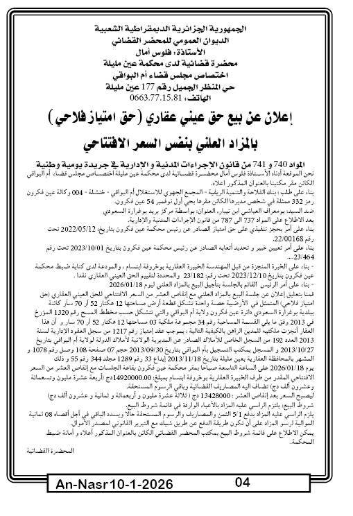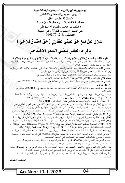 Il sera procédé à la vente au plus offrant et dernier enchérisseur le : 18/01/2026';