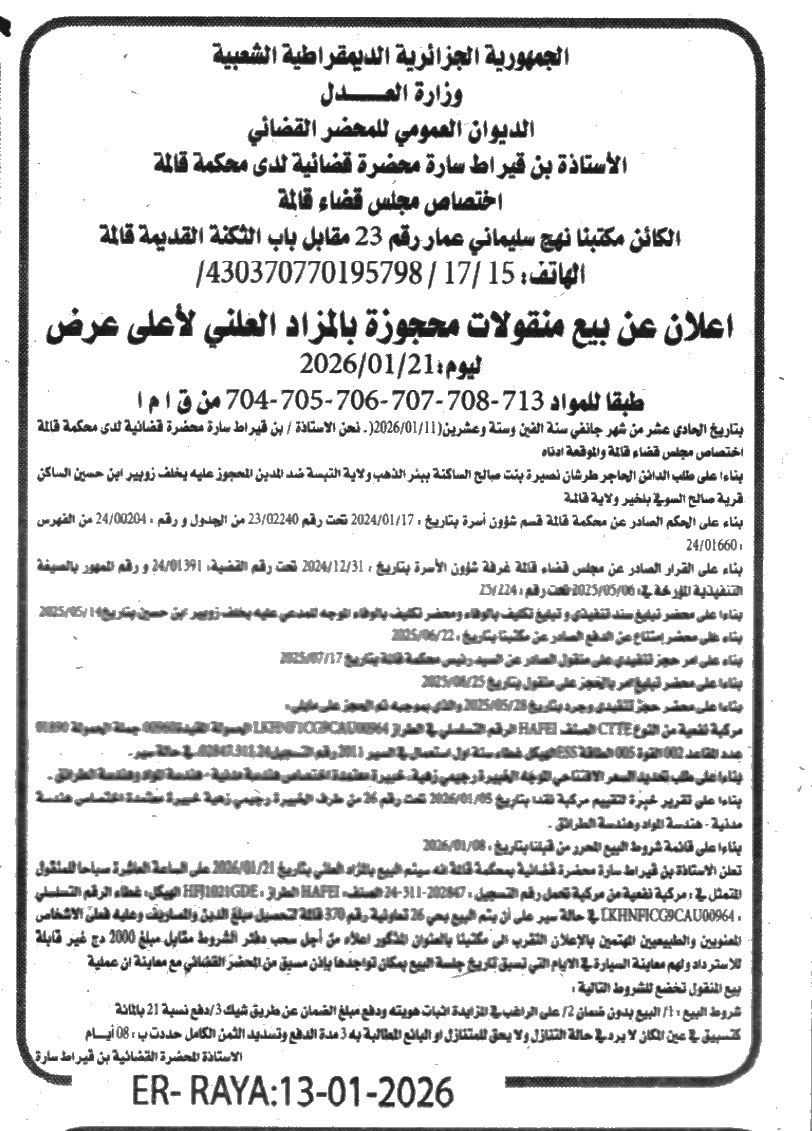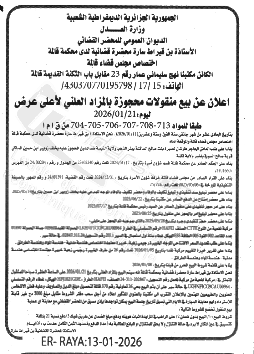 Il sera procédé à la vente au plus offrant et dernier enchérisseur le : 21/01/2026';