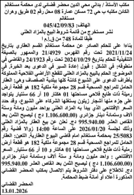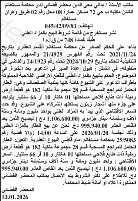 Il sera procédé à la vente au plus offrant et dernier enchérisseur le : 20/01/2026';