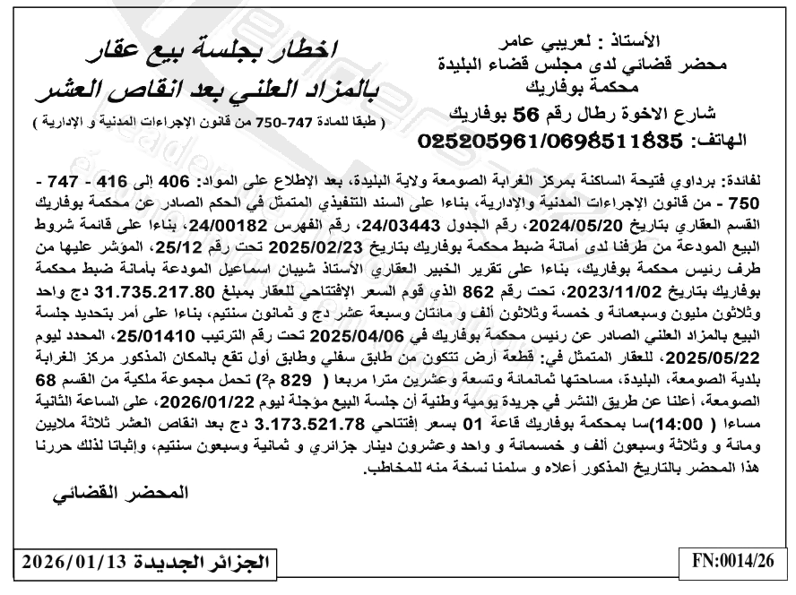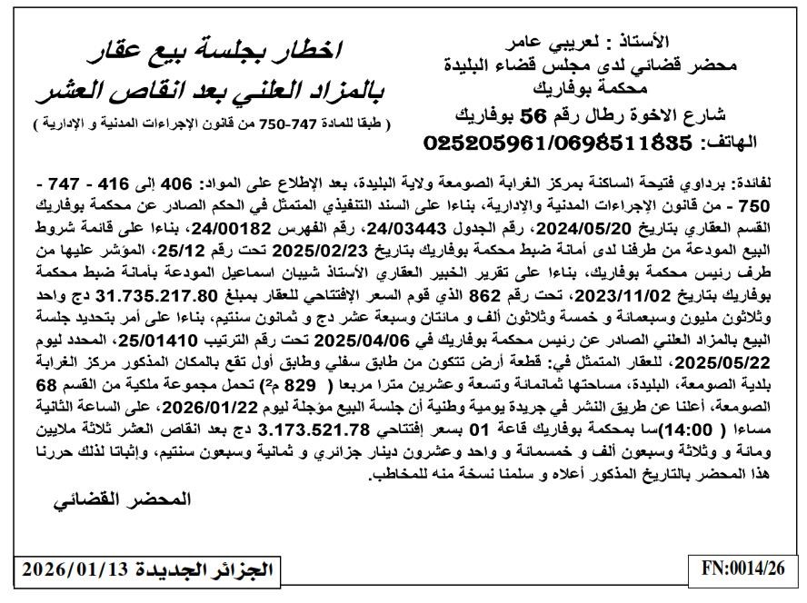 Il sera procédé à la vente au plus offrant et dernier enchérisseur le :