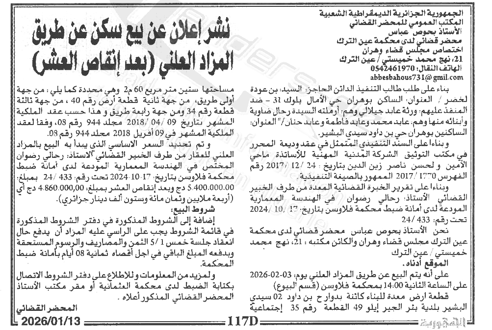 Il sera procédé à la vente au plus offrant et dernier enchérisseur le :