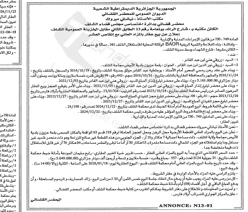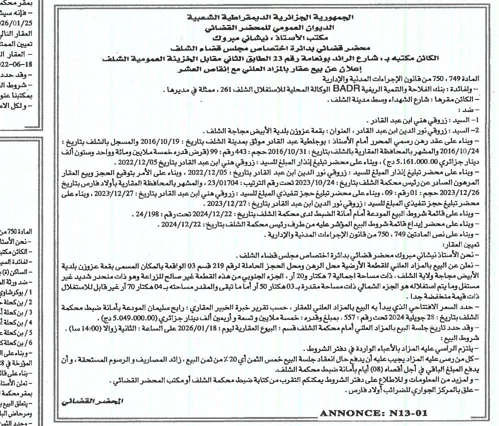 Il sera procédé à la vente au plus offrant et dernier enchérisseur le : 20/01/2026';