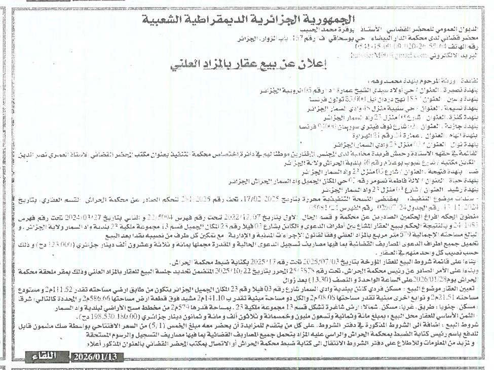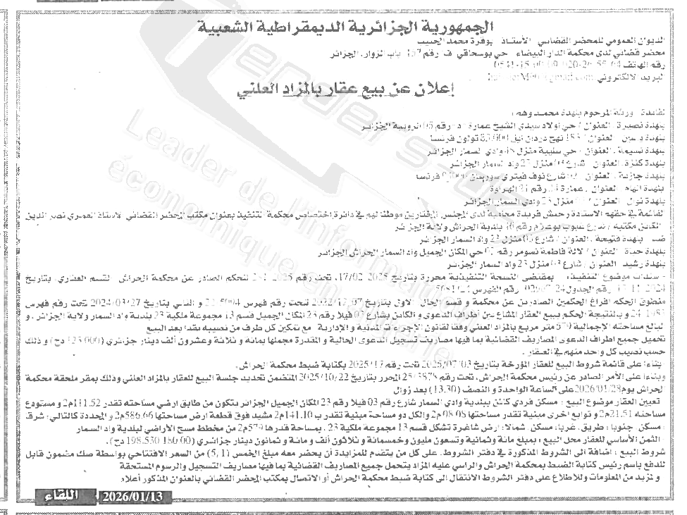Il sera procédé à la vente au plus offrant et dernier enchérisseur le : 20/01/2026';