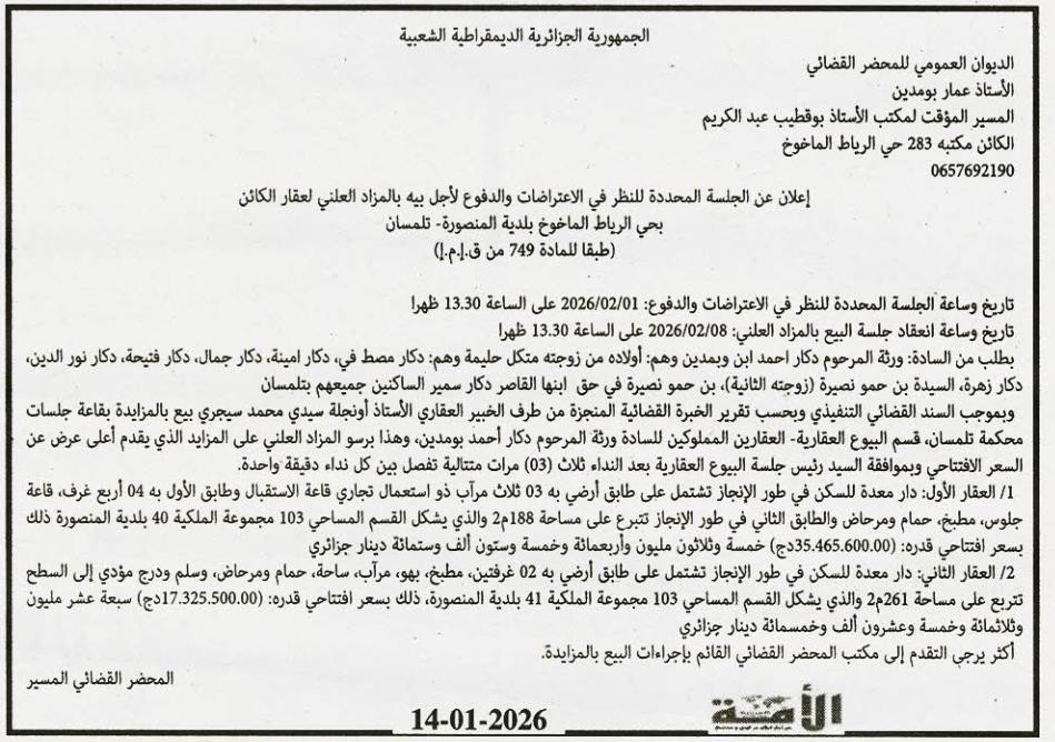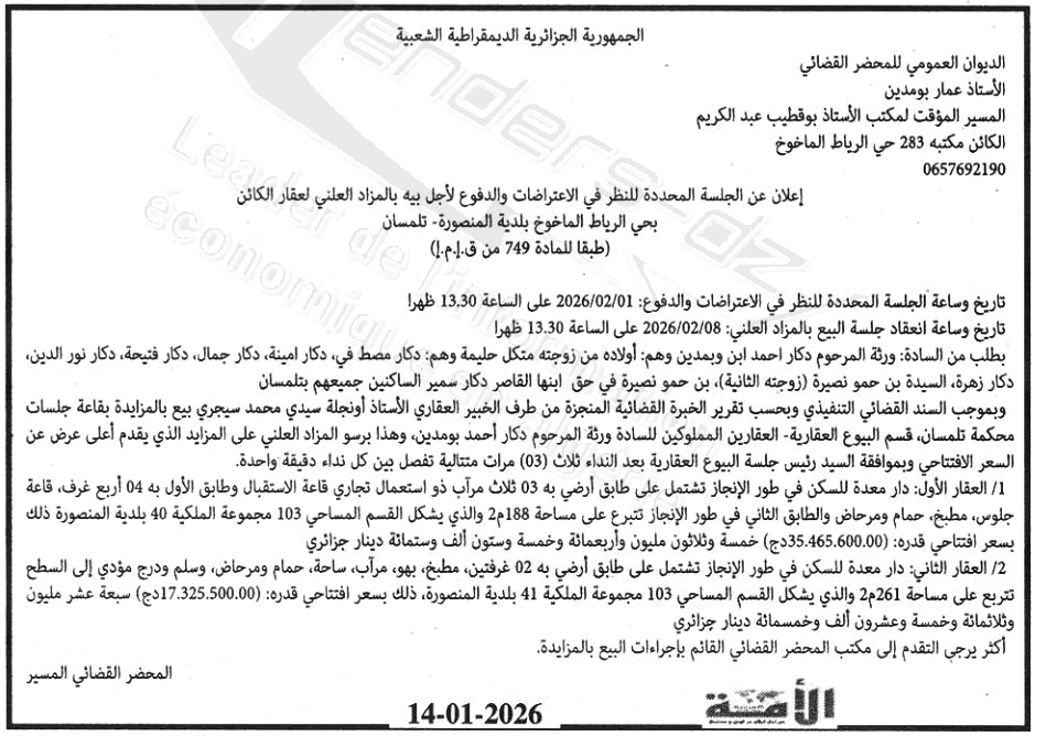 Il sera procédé à la vente au plus offrant et dernier enchérisseur le :