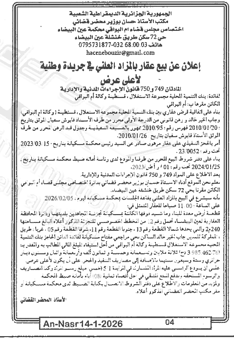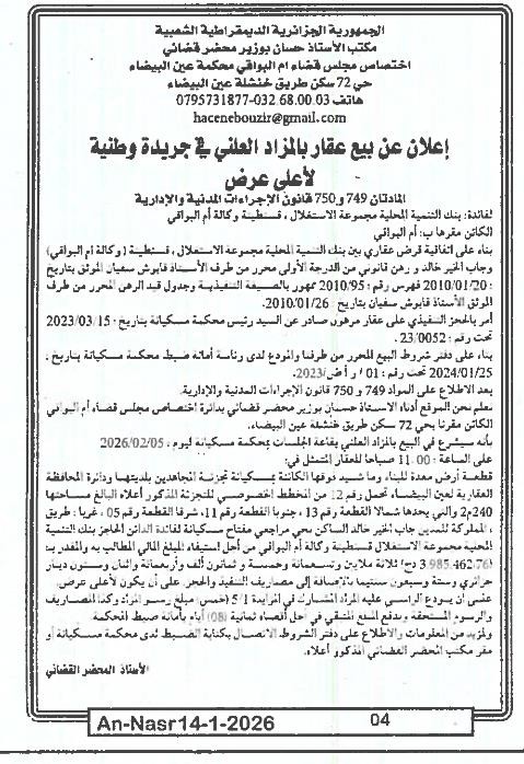 Il sera procédé à la vente au plus offrant et dernier enchérisseur le :