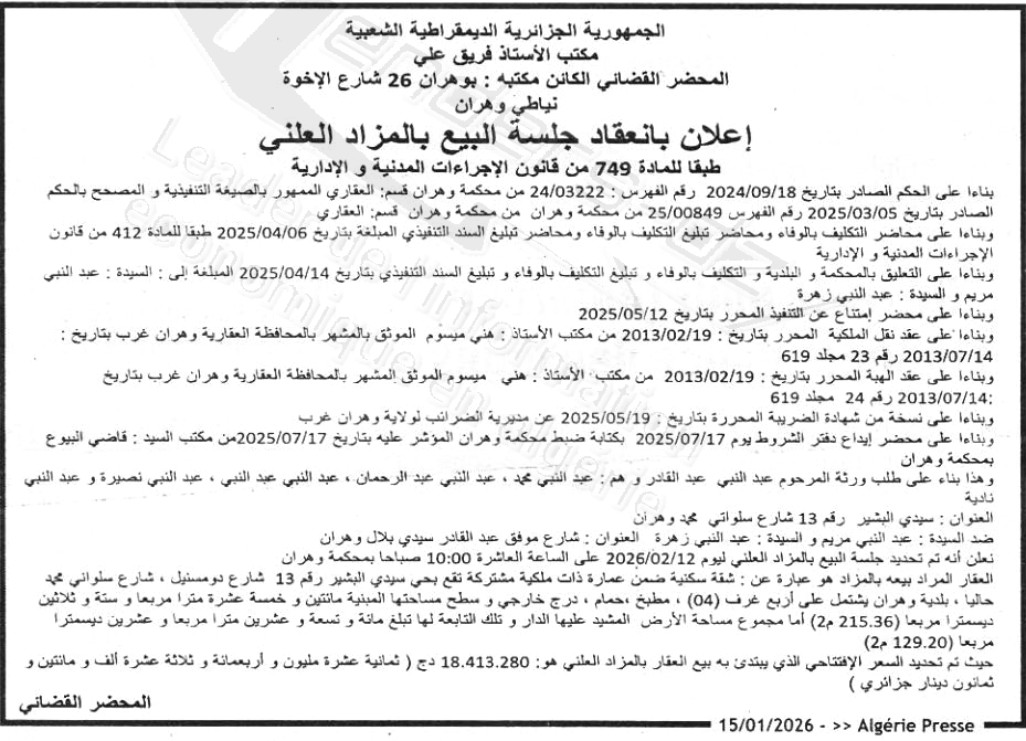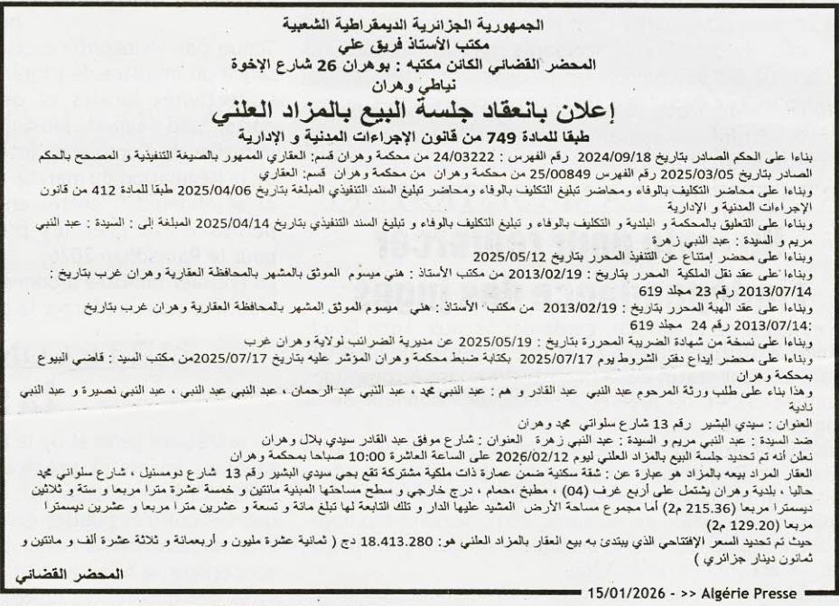 Il sera procédé à la vente au plus offrant et dernier enchérisseur le : 22/01/2026';