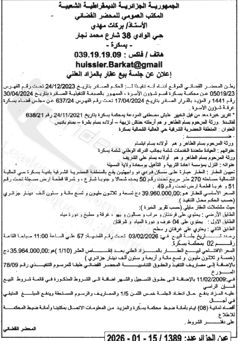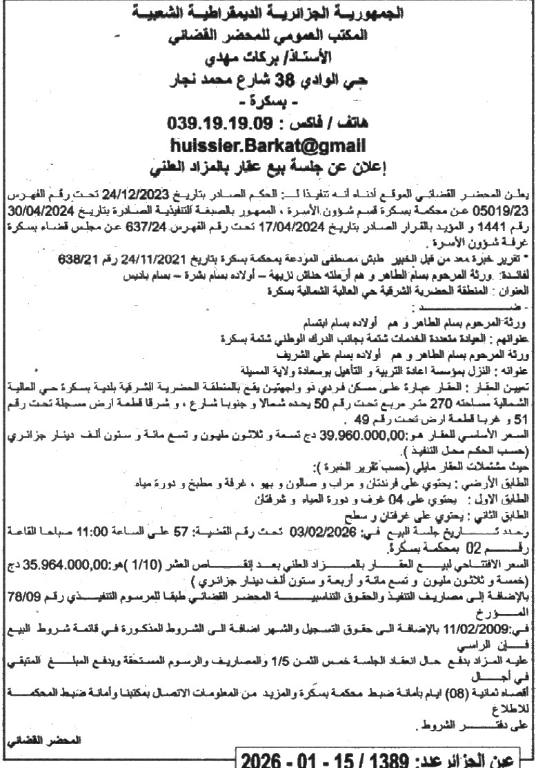 Il sera procédé à la vente au plus offrant et dernier enchérisseur le :