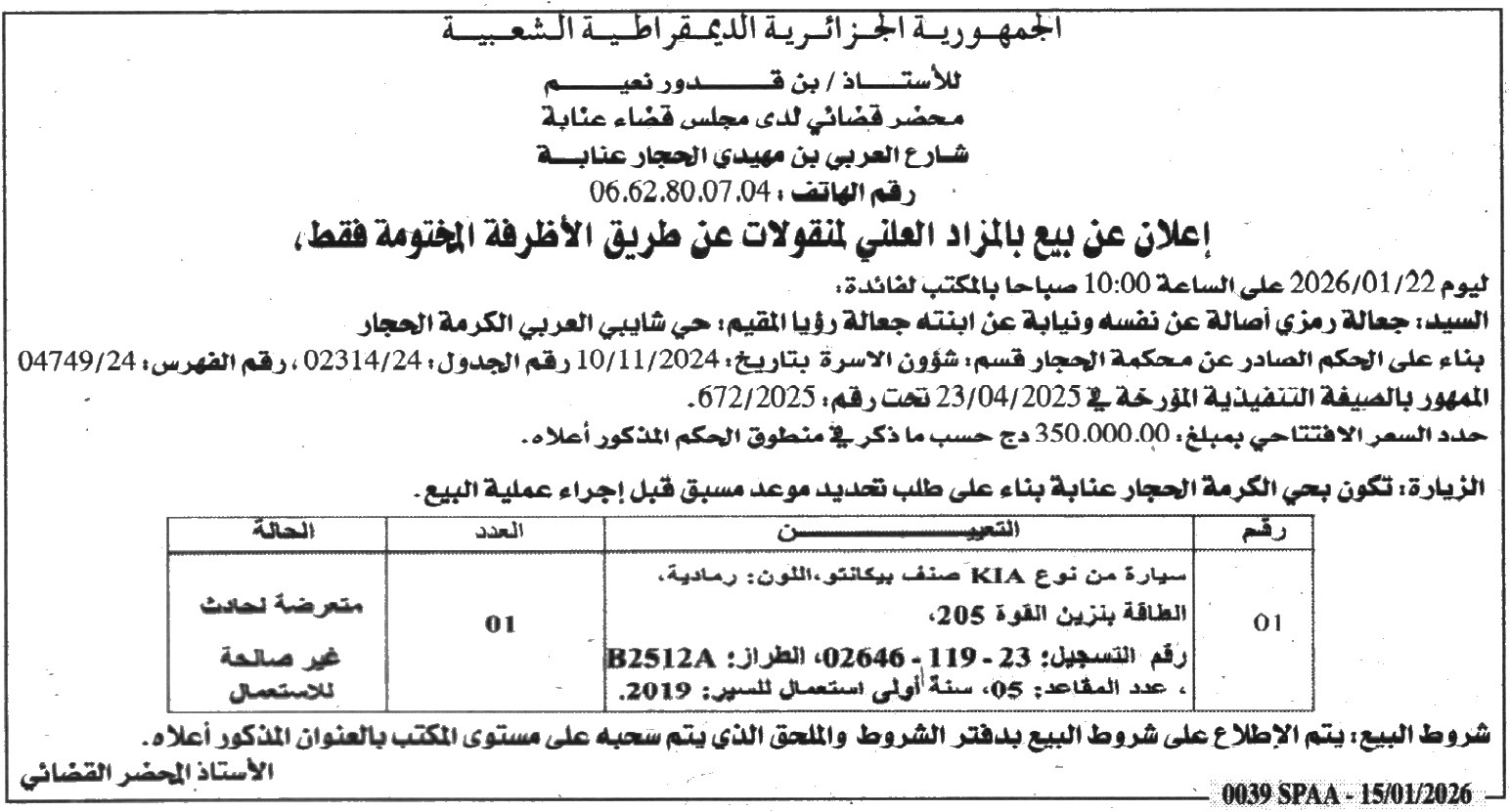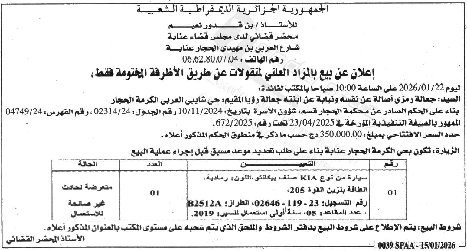 Il sera procédé à la vente au plus offrant et dernier enchérisseur le :