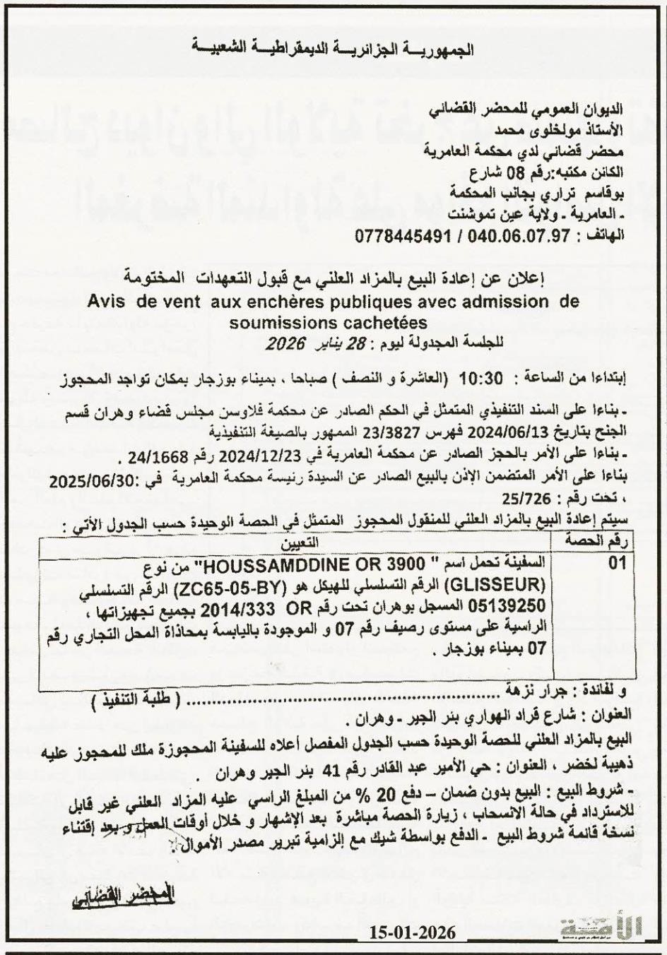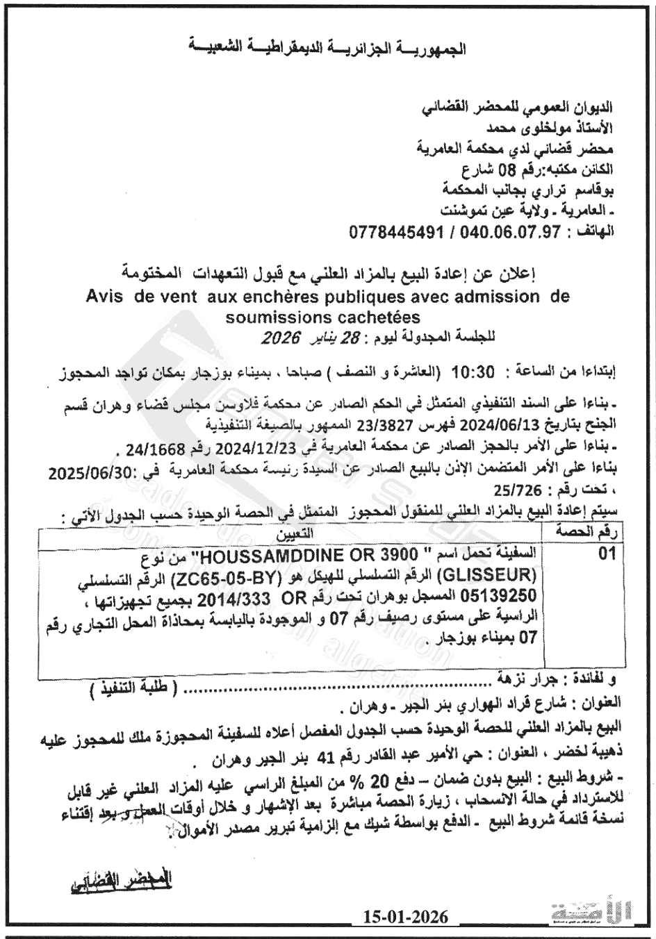 Il sera procédé à la vente au plus offrant et dernier enchérisseur le : 22/01/2026';