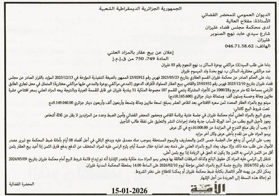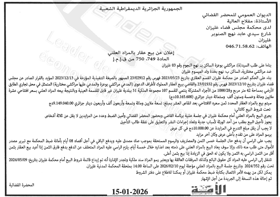 Il sera procédé à la vente au plus offrant et dernier enchérisseur le : 22/01/2026';
