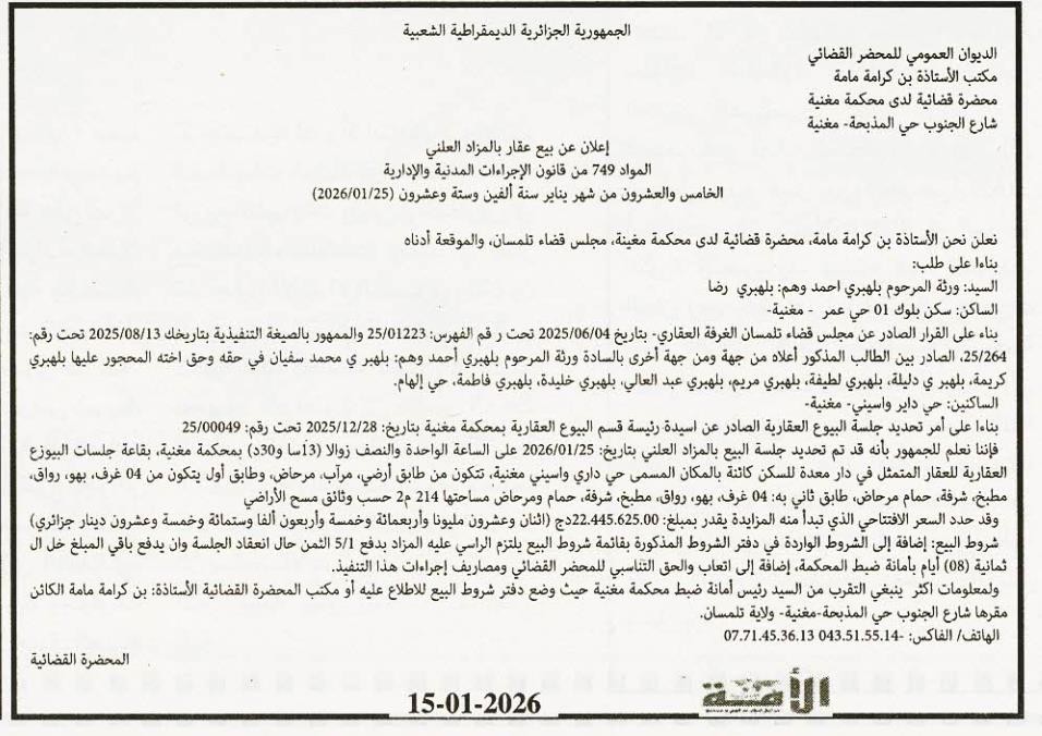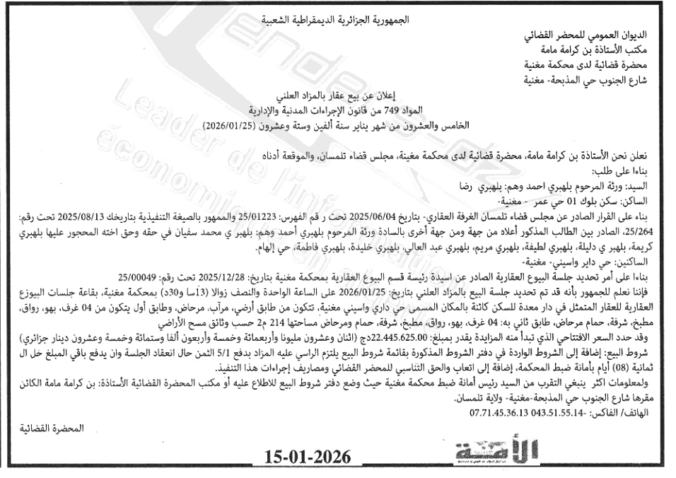 Il sera procédé à la vente au plus offrant et dernier enchérisseur le :