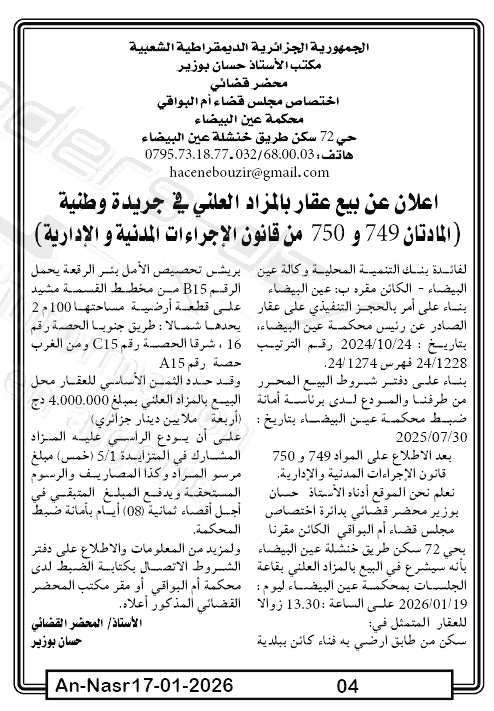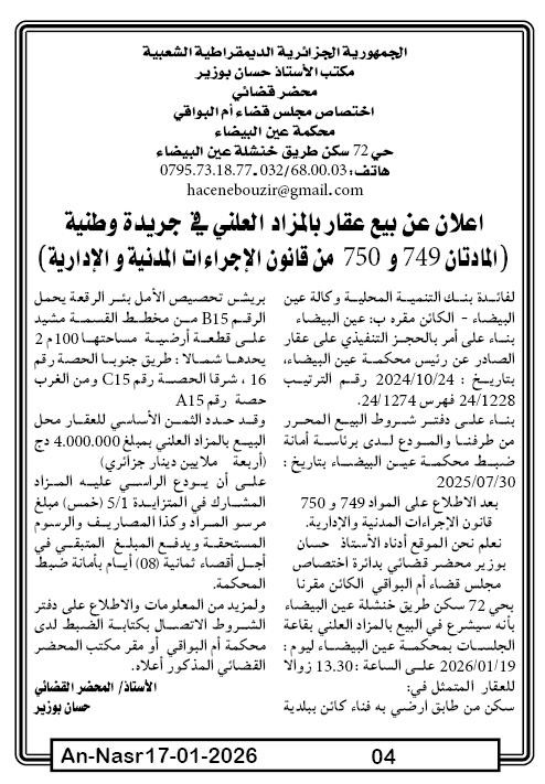 Il sera procédé à la vente au plus offrant et dernier enchérisseur le :