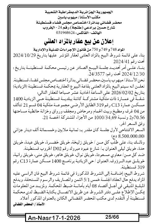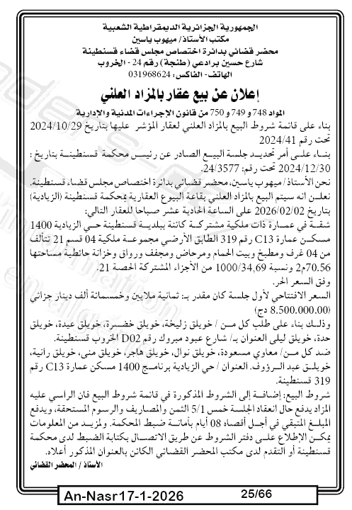 Il sera procédé à la vente au plus offrant et dernier enchérisseur le : 24/01/2026';