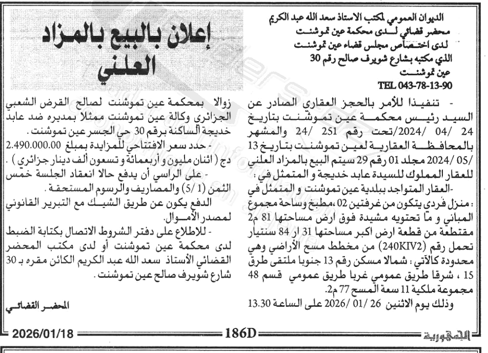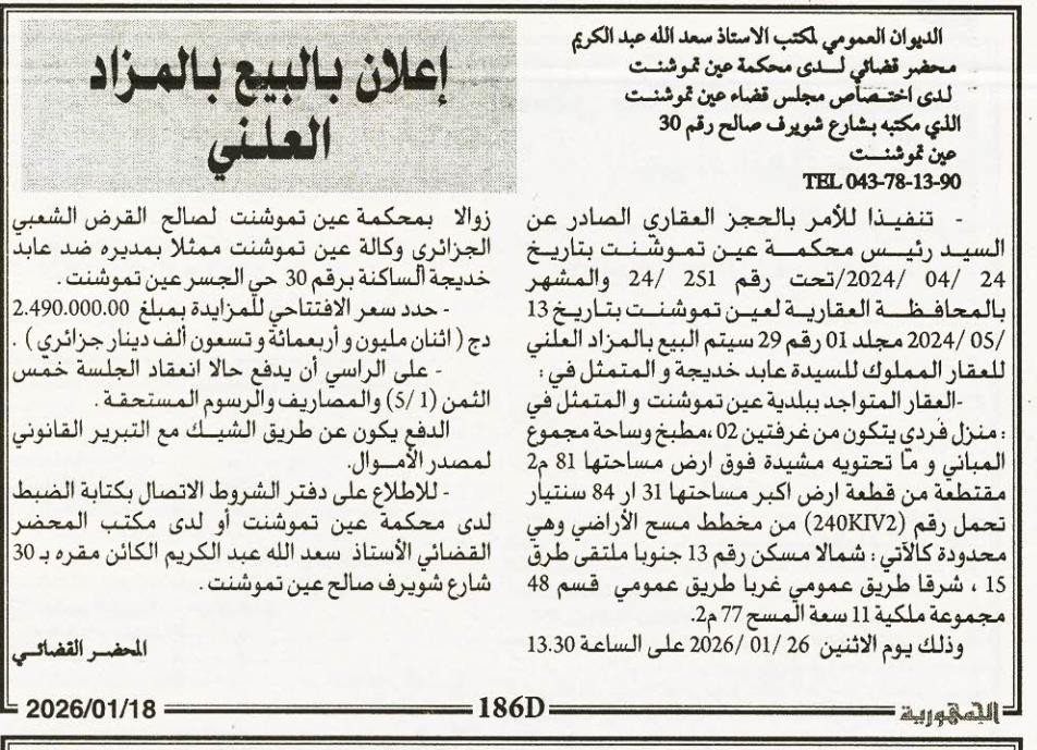 Il sera procédé à la vente au plus offrant et dernier enchérisseur le : 26/01/2026';