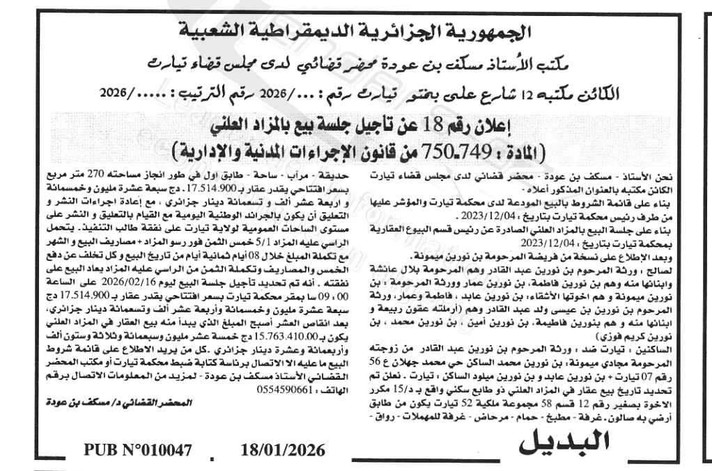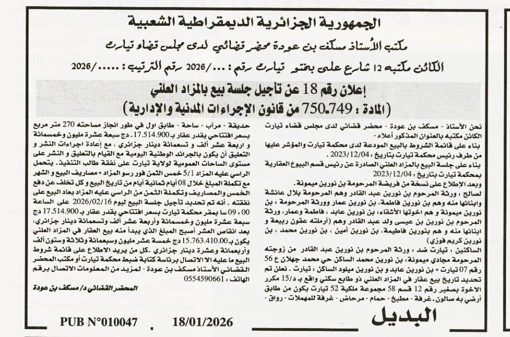 Il sera procédé à la vente au plus offrant et dernier enchérisseur le :
