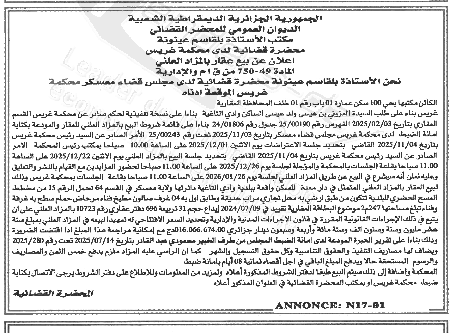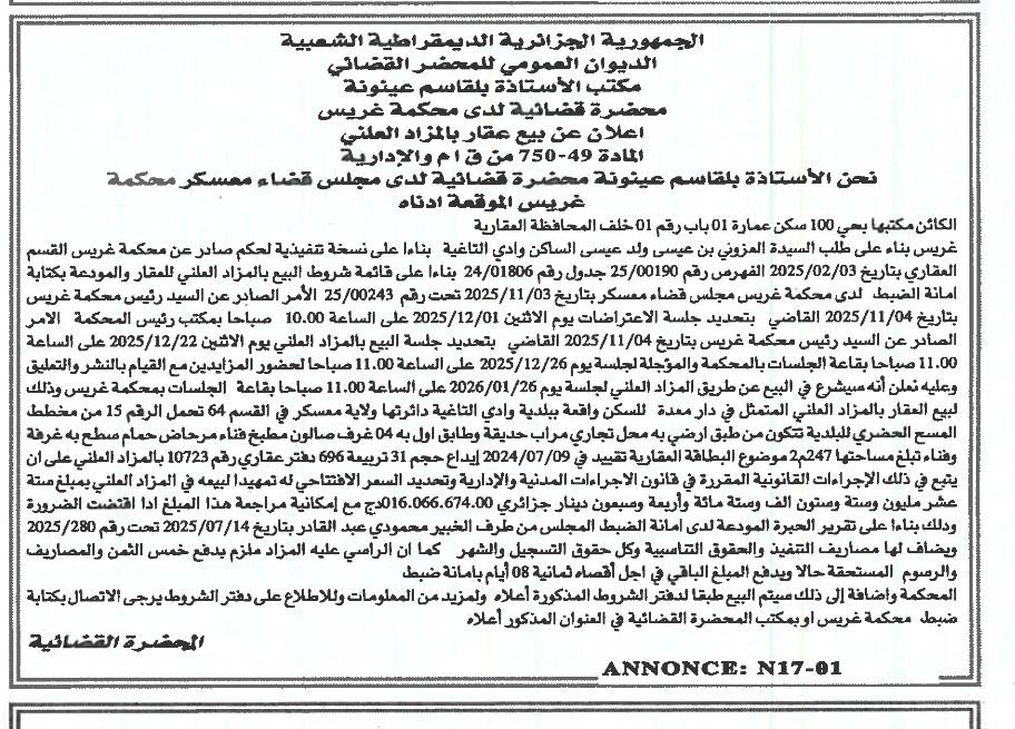 Il sera procédé à la vente au plus offrant et dernier enchérisseur le :