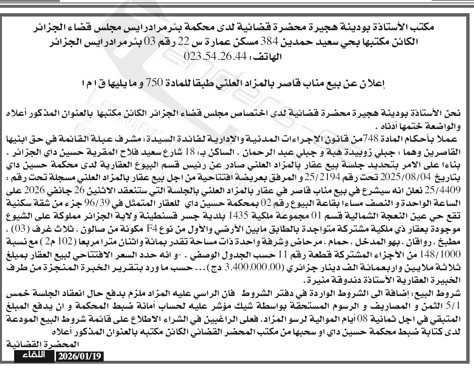 Il sera procédé à la vente au plus offrant et dernier enchérisseur le : 26/01/2026';