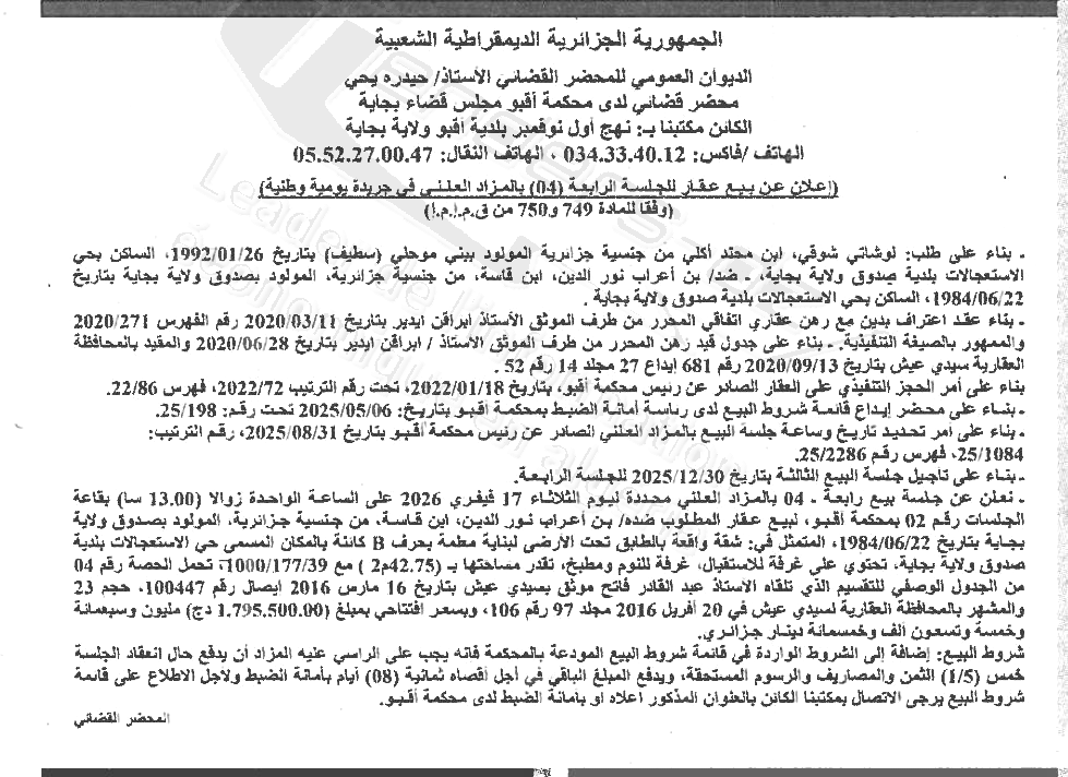 Il sera procédé à la vente au plus offrant et dernier enchérisseur le :